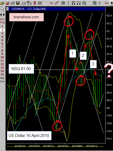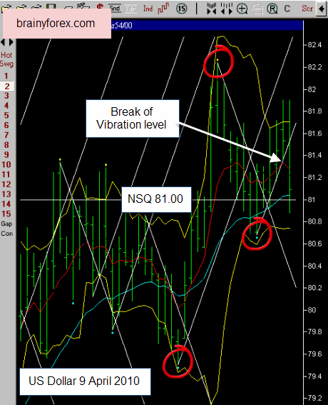 The US stock market broke its time vibration on Friday 16 April. It also closed under its natural square level of 11,100 points. (11,019). We now see the possibility of a few days down or sideways price action. This could push the US Dollar back again above the 81.00 level temporarily? Also notice the 1,2,3 zig zag pattern which usually has a high probability of completing a move.