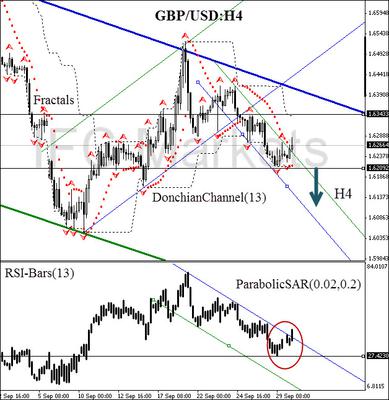 Here we consider the GBP/USD behavior on the H4 chart. Currently, the price broke the H4 trend line. However, we suggest the possible return to the downtrend corridor as the daily trend is influenced by bears. Donchian Channel confirms that investors are being pessimistic about the British currency. The key support breach at 1.62092 will lead to Parabolic SAR reversal in the direction towards the red zone, and we will get the necessary bearish confirmation. At this moment it is necessary to get an additional signal on the part of the RSI-Bars oscillator: the level at 27.4230%. For opening a conservative position we suggest limiting the risks by the last fractal resistance at 1.63433. This level is strengthened by Parabolic SAR historical values and the upper boundary of Donchian Channel.